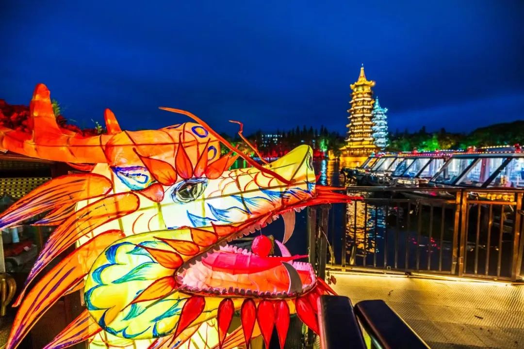 19时,伴随着“嘟嘟——”的游船启动声音,20多艘满载游客的游船组成龙行船队荡开粼粼水面,犹如百米巨龙水上巡游,自日月湾码头出发向木龙湖方向驶去,震撼壮观,令人惊叹。观双塔、赏月色婆娑......轻舟之上,长杆挑动渔火,美妙的舞姿摇曳着,让人目不暇接。一路船游、一路欢歌,近赏鱼鹰捕鱼、夜观无人机梦幻光影秀、水上互动音乐会、畅饮漓泉啤酒。