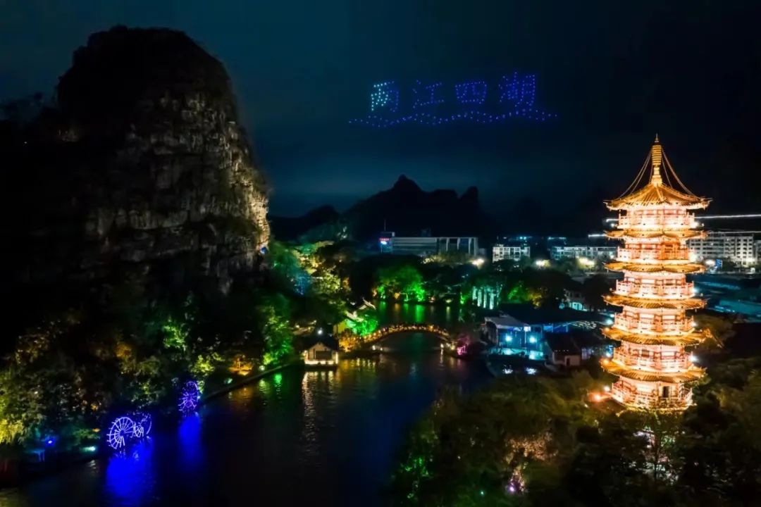 20时,游船驶至木龙湖,200架无人机组成表演方阵,如夜空中飞舞的精灵,在两江四湖上灵动绽放。半个小时的表演时间里,无人机不断变换造型,演绎不同的图案和文字。桂林旅股、两江四湖、汇众旅游、五粮液等品牌图案伴随美妙乐曲依次呈现,在夜空闪耀,全方位展示桂林旅游的独特魅力。