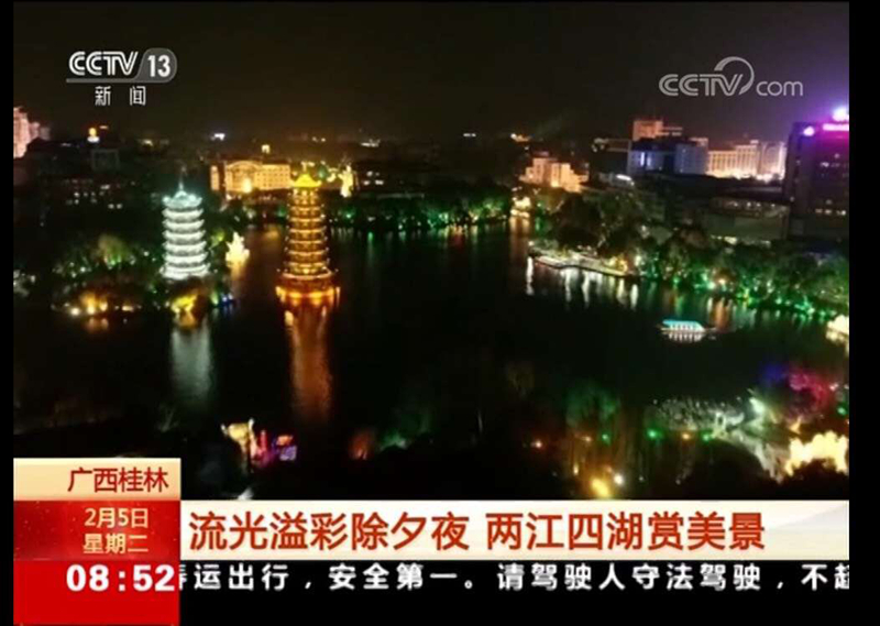 除夕当晚,两江四湖景区连续2次出现在央视一台黄金时间段直播现场,向全球展示了作为“桂林名片”的独特魅力,“流光溢彩除夕夜,两江四湖赏美景”已成为景区最响亮的夜游宣传口号。大年初一上午《朝闻天下》栏目又报道的两江四湖美景航拍短视频,再次吸引了许多游人的眼球。