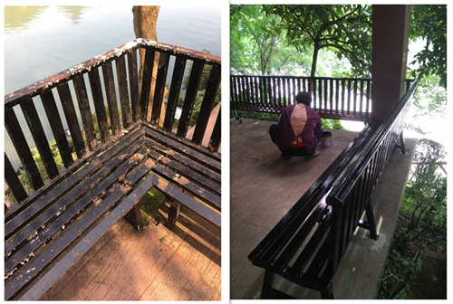 桂湖景区东斗笠亭、双亭周围护栏铁长椅腐朽
