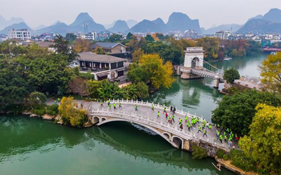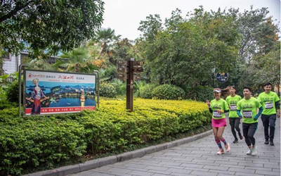 在现场,他们为桂林两江四湖景区的唯美风光大声点赞,并与大家一起欢乐谈笑地跑完全程。
