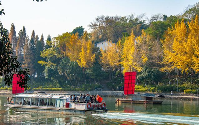 此刻的两江四湖,正是冬日观景最佳时期,湖边、桥上以及游船上,到处游人如织。沿途银杏树下,很多市民纷纷摄影留念。