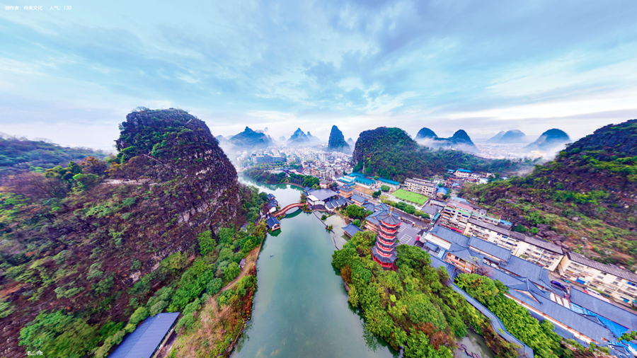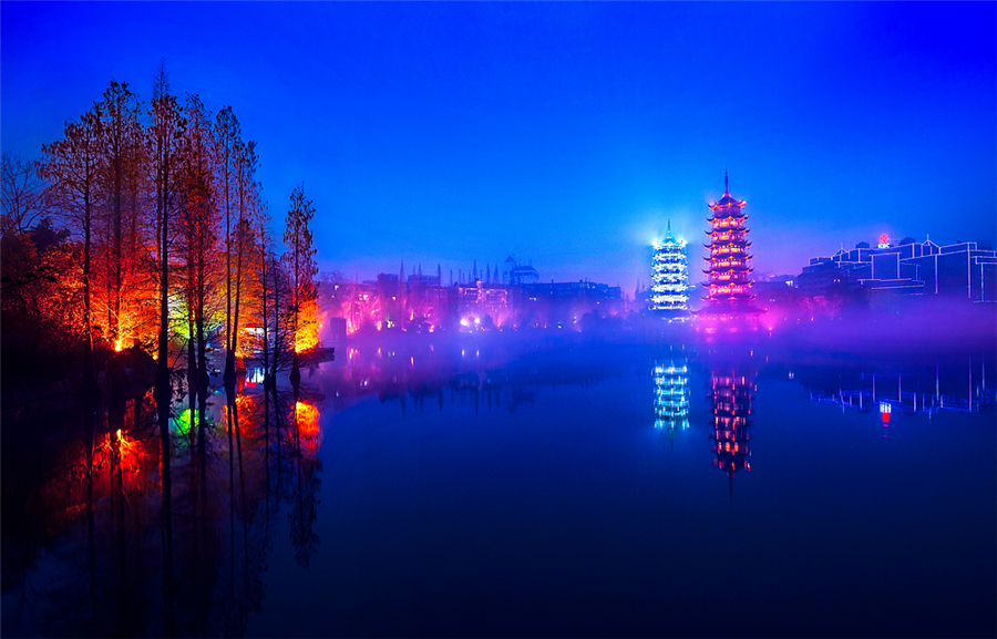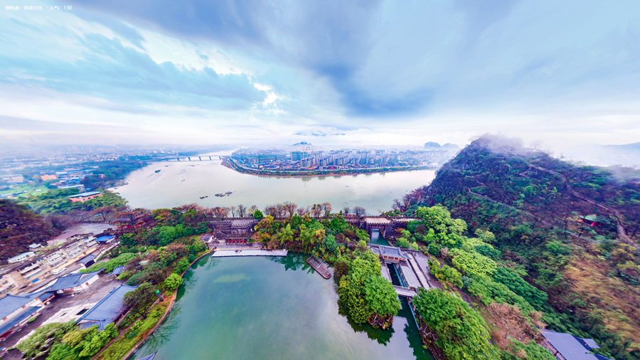 日月双塔静静伫立于如明镜般湖面,木龙湖畔古城墙则巍然而立,仿佛守候某个古老的时空诺言。在巍峨逍遥楼的俯瞰下,百里漓江饮饱象鼻山,再下穿解放桥奔腾而去,一江春水不复回。