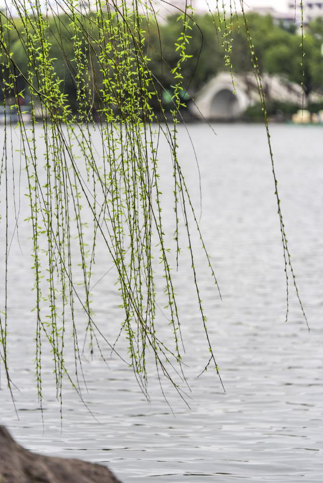 将近三月,两江四湖沿岸苍翠的林木,正在生发新叶,一丛丛淡黄嫩芽,轻巧地点缀于深绿老叶之上,仿佛素净容颜之上平添点点鹅黄。