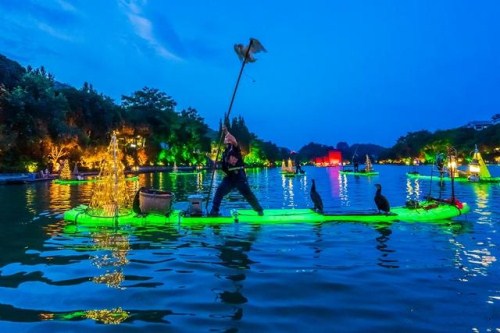 湖面上,渔火竹筏一字排开,星光点点像流动的银河。在激昂有力的吆喝声中,渔夫高高扬起竹竿,重重拍打水面,鱼鹰收到命令后敏捷地潜入水中,片刻之后就叼着活鱼返回水面。身临其境,场面看起来颇具古老的民族风情。