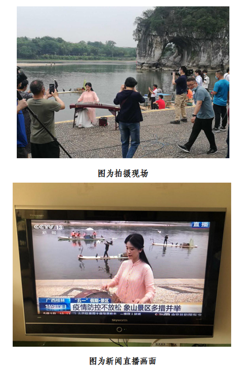 2020年5月1日黄金周第一天,在中央电视台栏目组的统一安排下,两江四湖演艺应邀参与了桂林象山景区直播拍摄工作。本次拍摄在央视13频道进行播出,主要展现新冠疫情后第一个旅游长假,桂林旅游景区的复工准备及游客游览情况。