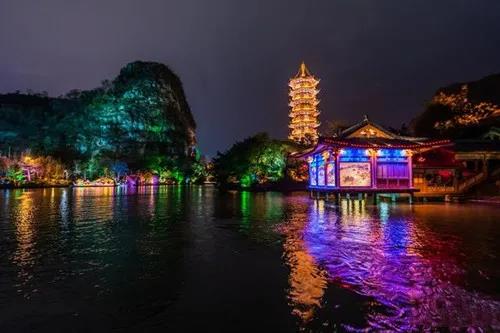 到了夜晚,当景区灯光全部亮起,出现梦幻般的画面:火树银花灯光秀,流光溢彩不夜天。灼灼生辉的日月双塔,一金一银交相辉映,二十余座各式桥梁,披着虹光飞架湖上。沿岸名山在灯光的陪衬下,展现异样风情。在清风拂面中乘船夜游,如梦如幻的迷人夜景,熏得游人渐入佳境。