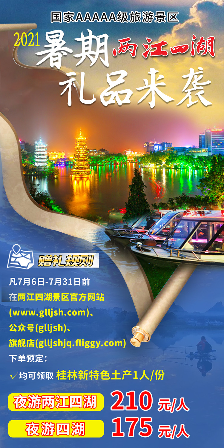2021年7月6-31日之间,在官网平台购夜游船票可以领取礼品!礼品是桂林新土特产,1成人领1份!
