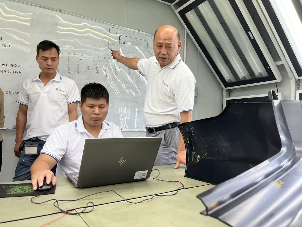 这是古显善(右一)与技术团队讨论模具制作图调整方案。新华社记者赵瑞希 摄
