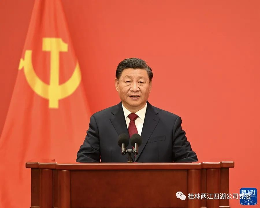 10月23日,刚刚在中国共产党第二十届中央委员会第一次全体会议上当选的中共中央总书记习近平和中共中央政治局常委李强、赵乐际、王沪宁、蔡奇、丁薛祥、李希在北京人民大会堂同中外记者亲切见面。这是习近平发表重要讲话。新华社记者 李学仁 摄