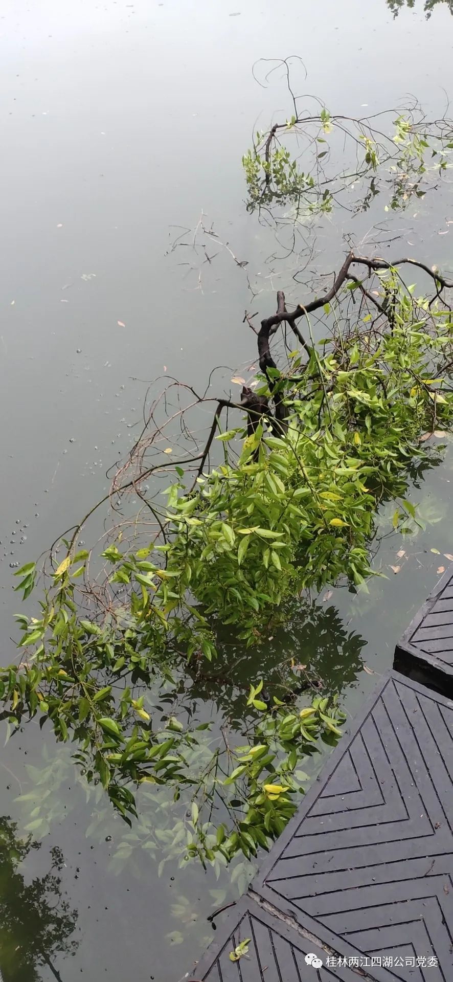 近日,运营管理部安管人员黄基雄接到报告,突发紧急状况,在榕湖水域玻璃桥转弯处,有树枝折断落入水中,且落点正处于转弯处,是游船驾驶员的盲区,对游船的安全行驶造成了严重的威胁。