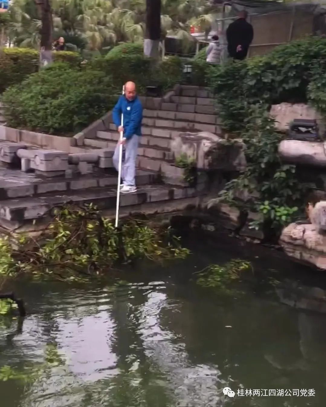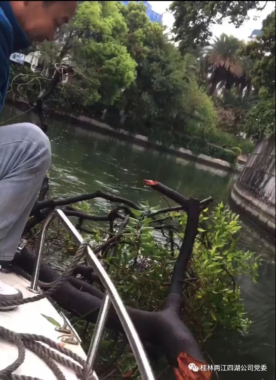 近日,运营管理部安管人员黄基雄接到报告,突发紧急状况,在榕湖水域玻璃桥转弯处,有树枝折断落入水中,且落点正处于转弯处,是游船驾驶员的盲区,对游船的安全行驶造成了严重的威胁。