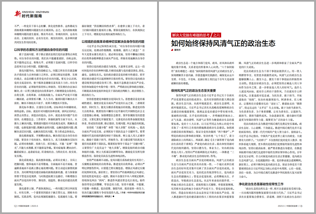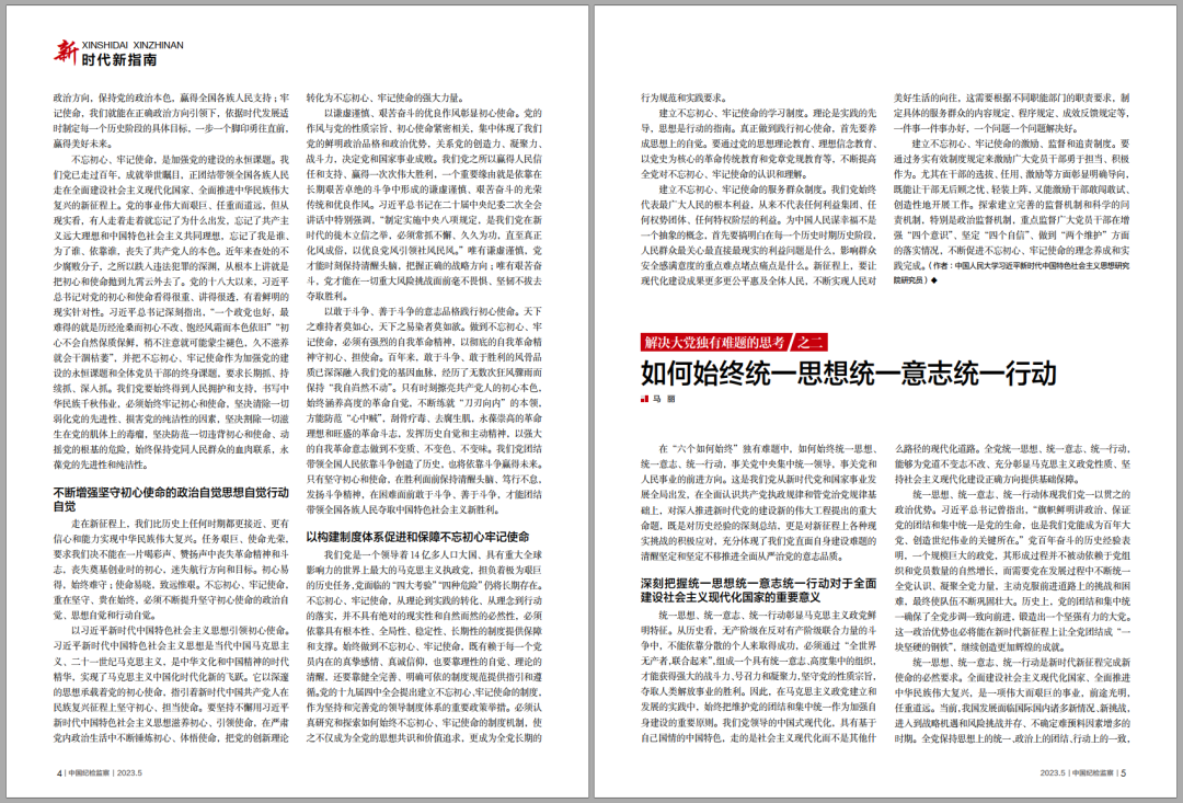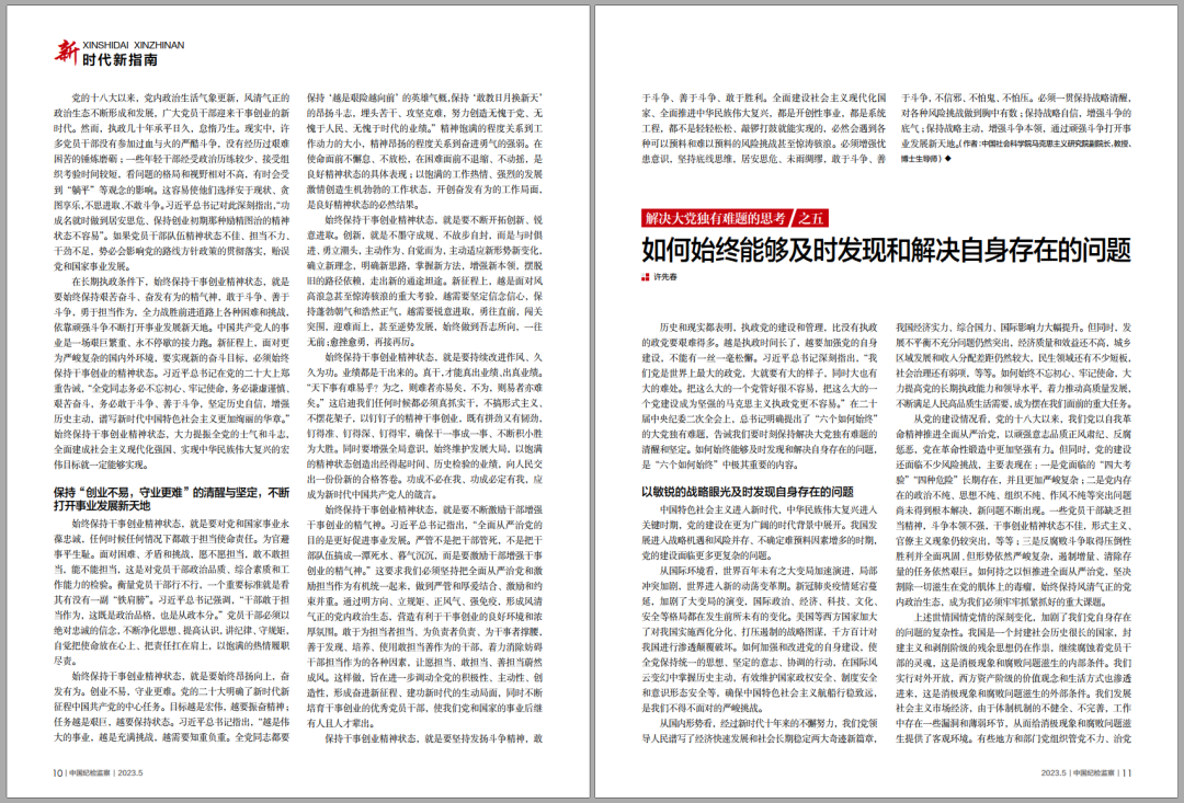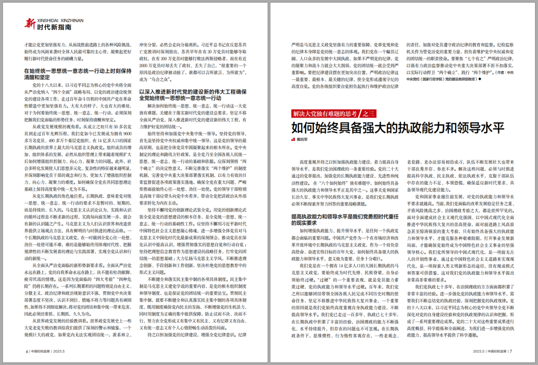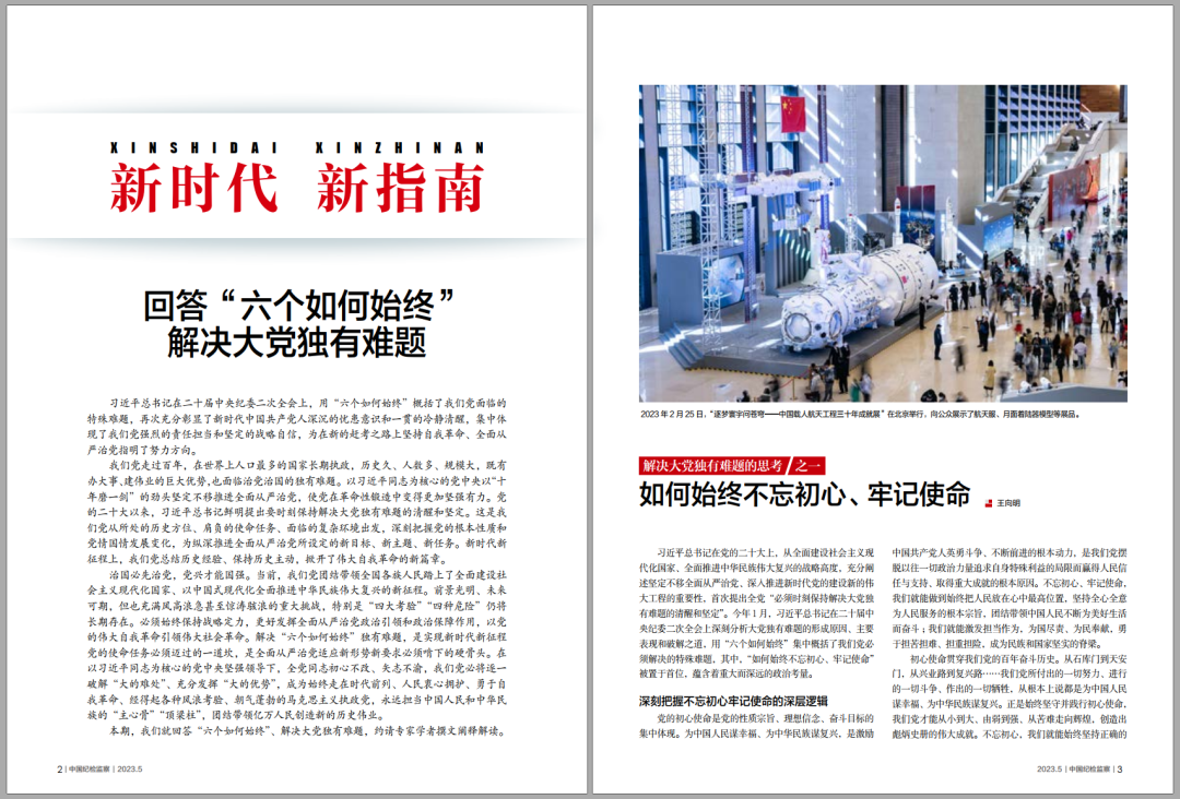 习近平总书记在二十届中央纪委二次全会上,用“六个如何始终”概括了我们党面临的特殊难题,再次充分彰显了新时代中国共产党人深沉的忧患意识和一贯的冷静清醒,集中体现了我们党强烈的责任担当和坚定的战略自信,为在新的赶考之路上坚持自我革命、全面从严治党指明了努力方向。 我们党走过百年,在世界上人口最多的国家长期执政,历史久、人数多、规模大,既有办大事、建伟业的巨大优势,也面临治党治国的独有难题。以习近平同志为核心的党中央以“十年磨一剑”的劲头坚定不移推进全面从严治党,使党在革命性锻造中变得更加坚强有力。党的二十大以来,习近平总书记鲜明提出要时刻保持解决大党独有难题的清醒和坚定。这是我们党从所处的历史方位、肩负的使命任务、面临的复杂环境出发,深刻把握党的根本性质和党情国情发展变化,为纵深推进全面从严治党所设定的新目标、新主题、新任务。新时代新征程上,我们党总结历史经验、保持历史主动,掀开了伟大自我革命的新篇章。 治国必先治党,党兴才能国强。当前,我们党团结带领全国各族人民踏上了全面建设社会主义现代化国家、以中国式现代化全面推进中华民族伟大复兴的新征程。前景光明、未来可期,但也充满风高浪急甚至惊涛骇浪的重大挑战,特别是“四大考验”“四种危险”仍将长期存在。必须始终保持战略定力,更好发挥全面从严治党政治引领和政治保障作用,以党的伟大自我革命引领伟大社会革命。解决“六个如何始终”独有难题,是实现新时代新征程党的使命任务必须迈过的一道坎,是全面从严治党适应新形势新要求必须啃下的硬骨头。在 以习近平同志为核心的党中央坚强领导下,全党同志初心不改、矢志不渝,我们党必将逐一破解“大的难处”、充分发挥“大的优势”,成为始终走在时代前列、人民衷心拥护、勇于自我革命、经得起各种风浪考验、朝气蓬勃的马克思主义执政党,永远担当中国人民和中华民族的“主心骨”“顶梁柱”,团结带领亿万人民创造新的历史伟业。 本期,我们就回答“六个如何始终”、解决大党独有难题,约请专家学者撰文阐释解读。