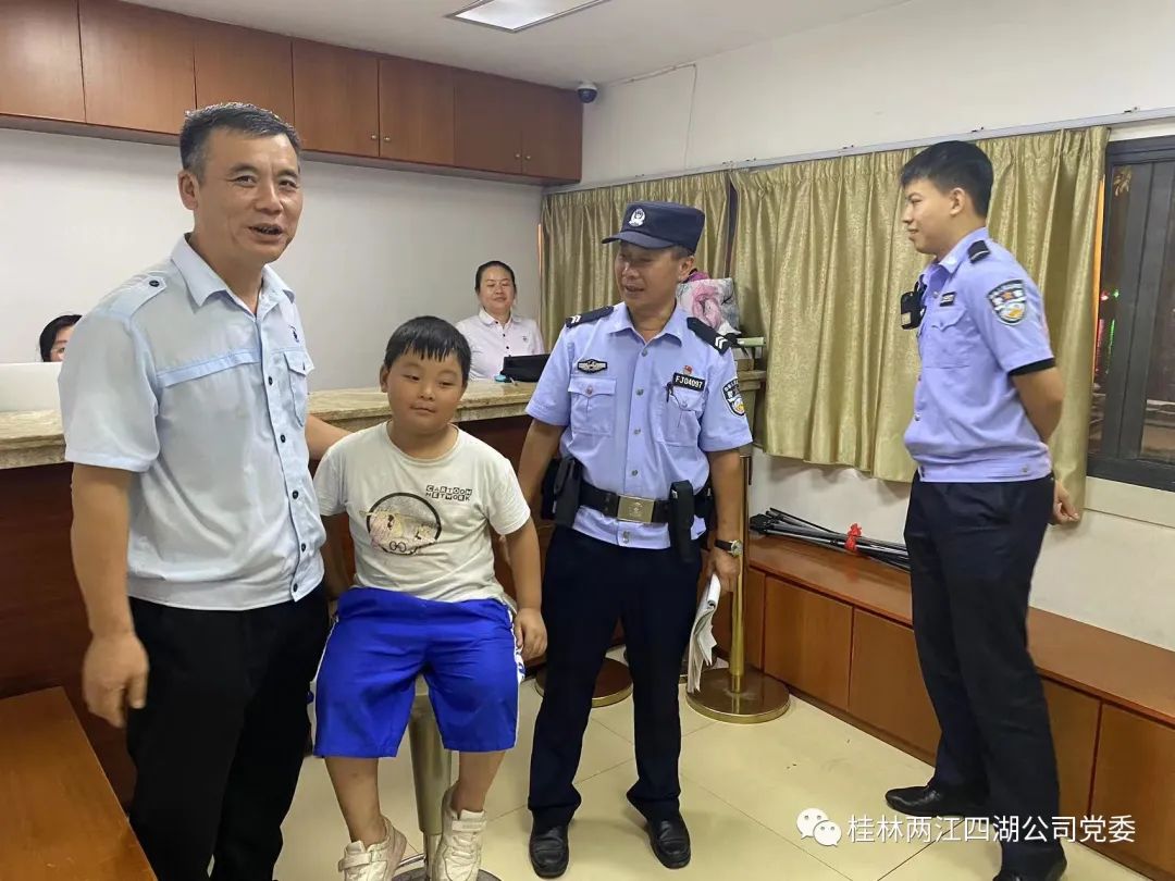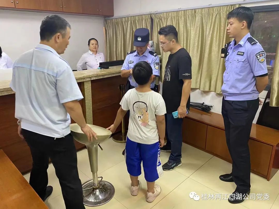 10月3日晚,公司保安在杉湖日月湾区域巡逻时在桂林粥城饭店门口处发现一个走失的小男孩,通过积极寻找,在民警同志的帮助下,顺利为走失男孩找到家属。