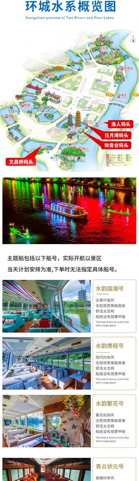 【游船安排】游船使用主题船,具体船号下单时无法指定,实际以景区当天安排或客服预约时告知为准。